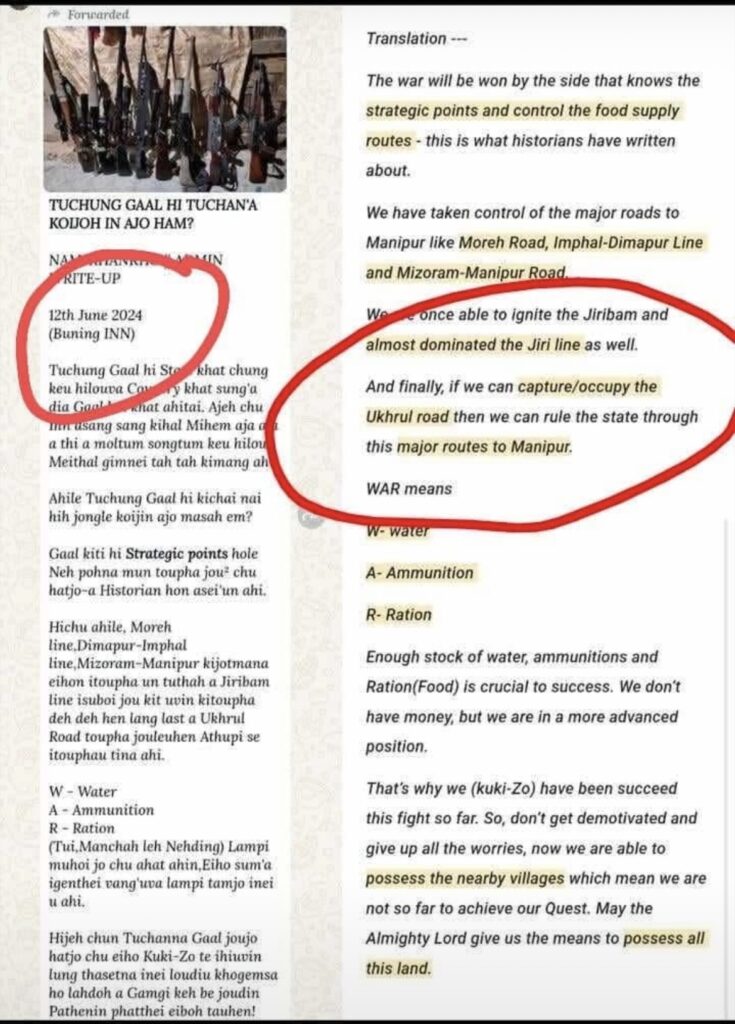 In no time, they scorched down 20 houses in the Litan Bazaar area while the helpless Tangkhul Naga villagers ran for their lives in the middle of the night. The biggest question about the intentions lies in their swift and coordinated attack and the speed at which Kuki militants arrived at the scene. Multiple videos circulated online show Kuki militants in bolero pick-ups and campers laughing and making fun as they moved into Litan Sareikhong and Shangkai as reinforcements. Eyewitnesses claim that the same vehicles that brought in the reinforcements evacuated the women and children away from their villages, laying bare their intentions to escalate the matter into a full-blown war. Was this event then, deliberately planned by them a long time back? A popular WhatsApp message dating back to June 12 2024 may hold the answer to this.